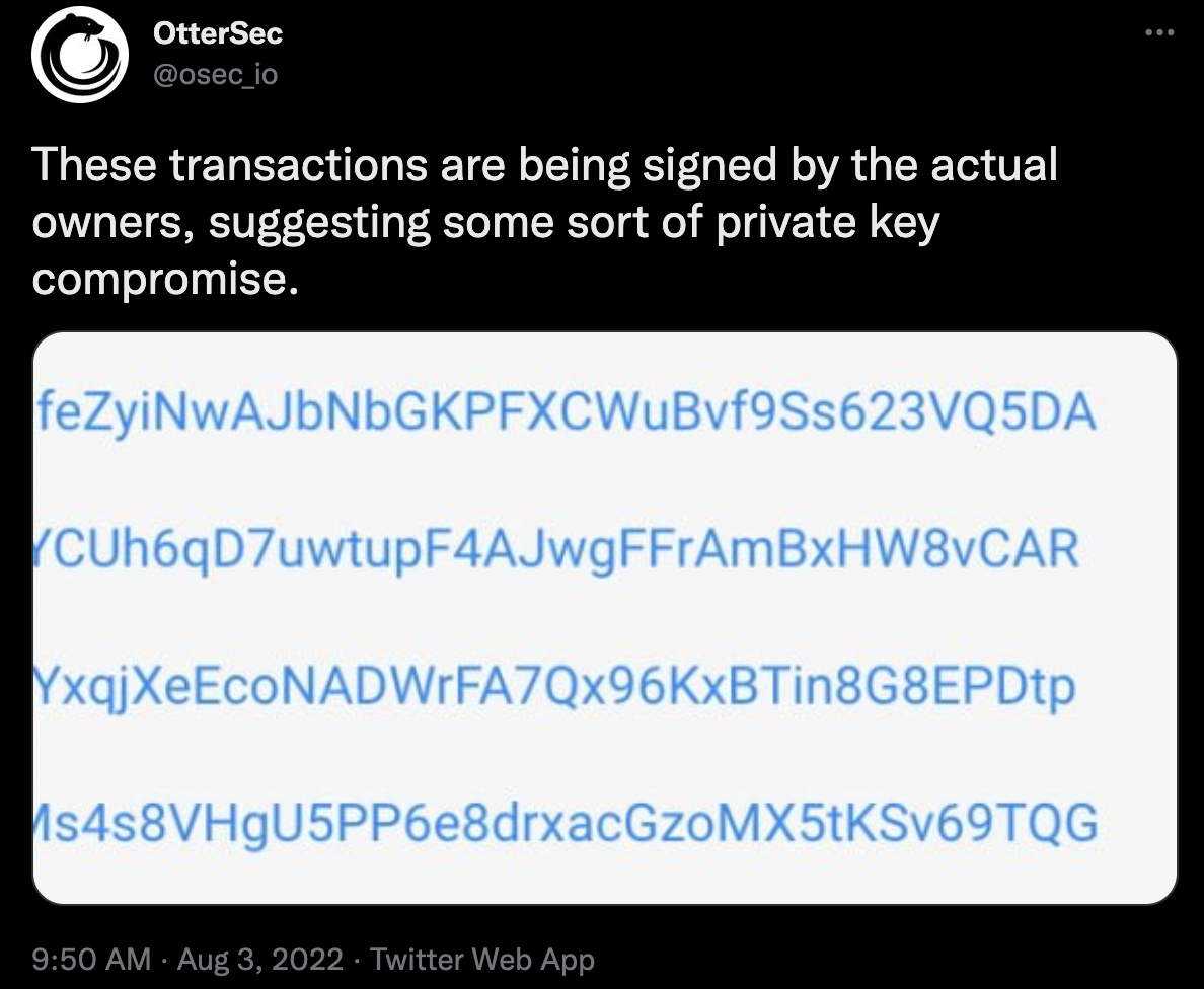 블록체인 감사 전문 업체 OtterSec에 따르면 “거래가 실제 소유자에 의해 진행됐다고 나오는 걸로 보아 개인키 해킹 가능성이 있어 보인다”고 말했습니다.