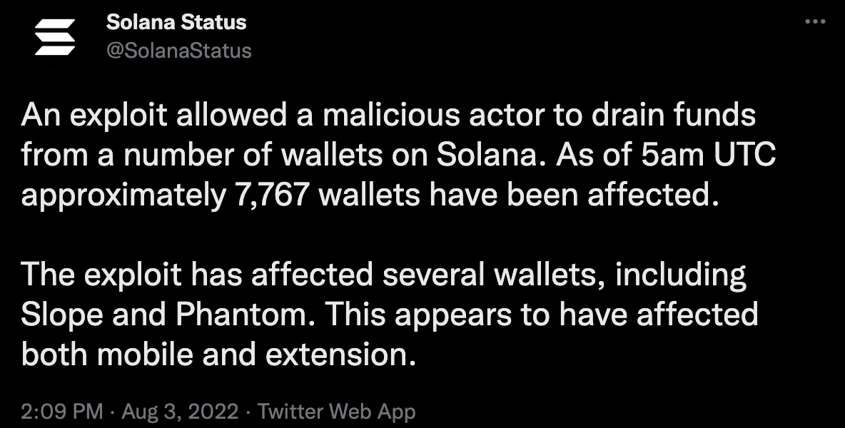 솔라나는 8월 2일 오전 5시(현지 시각)에 발생한 공격이 솔라나 기반 비수탁형 지갑인 ‘팬텀’과 슬로프(Slope), Solflare(솔플레어), 트러스트(Trust) 지갑 등 약 7,700개 이상의 지갑에서 자금이 유출되었다고 말했습니다.