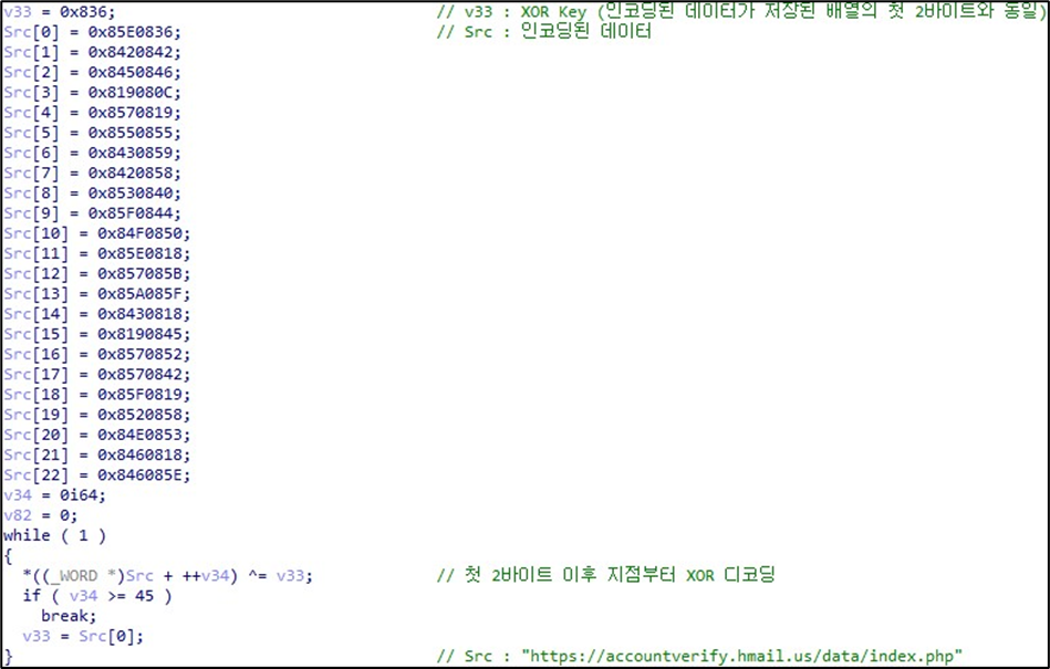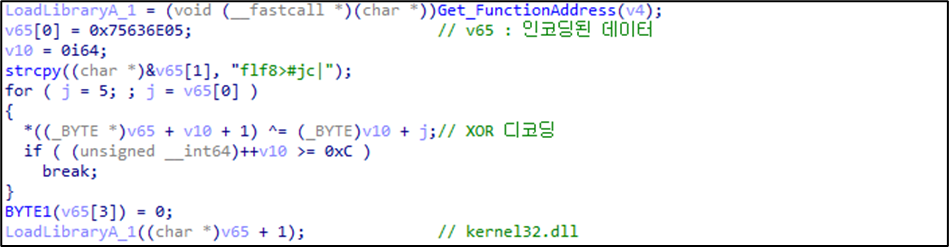 로드 할 DLL 이름이나 C2 URL 등 주요 문자열들은 XOR 인코딩 되어 있으며, 이는 악성코드 실행 시 메모리상에서 디코딩 된다. 문자열마다 적용되는 디코딩 로직은 일부 차이가 있는 것으로 확인되며, 주요 디코딩 로직은 다음과 같다.