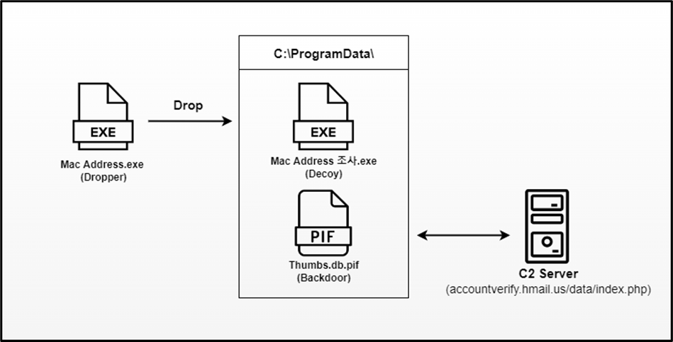 | 245E67E649FF254200CF310630CC960B | Mac Address 조사.exe (Decoy) |
