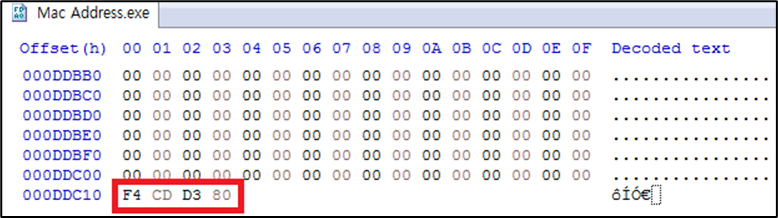 | Mac Address 조사.exe | (File_End_Offset) - 532 - 441856 = 0x71C00 (size : 441856) |
