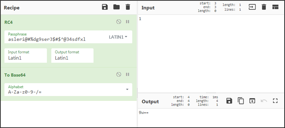 | [ RC4 Key 디코딩 전 – 빅 엔디안 ] Hex : 07 15 0A 03 14 0F 26 45 43 02 01 5F 15 03 14 55 42 45 42 38 26 55 52 15 02 00 1E 0A [ RC4 Key 디코딩 후 ] Hex : 61 73 6C 65 72 69 40 23 25 64 67 39 73 65 72 33 24 23 24 5E 40 33 34 73 64 66 78 6C ASCII : asleri@#%dg9ser3$#$^@34sdfxl |