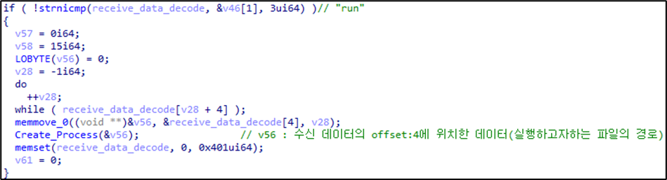 먼저, C2 서버에서 수신한 명령이 “run” 인지 비교한다. 수신한 명령이 “run”일 경우, 수신 데이터의 ofsset:4에 위치한 데이터(실행하고자 하는 파일의 경로)를 읽어 실행한다.