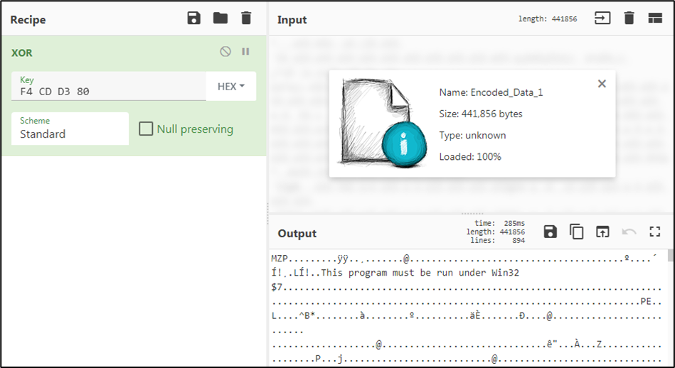 [표 2]에서 확인한 인코딩 된 데이터를 추출하여 XOR Key 값을 이용해 디코딩 시 드롭되는 실행 파일을 확인할 수 있다.