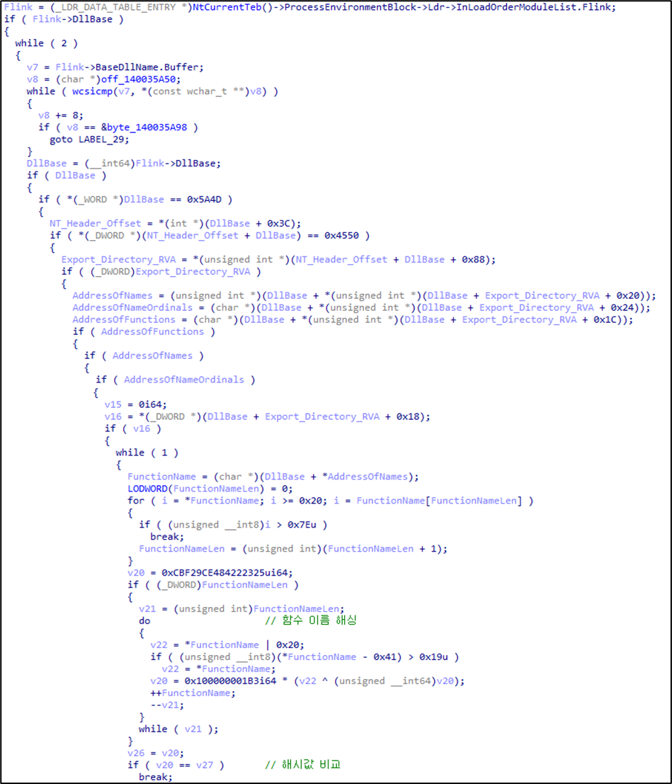API 목록을 확인하며, 각 API 이름을 해싱하여 필요한 API의 해시값과 동일한지 비교한다.