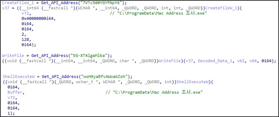 다음은 ‘C:\ProgramData\Mac Address 조사.exe’ 파일을 드롭하고 실행하는 루틴이다.