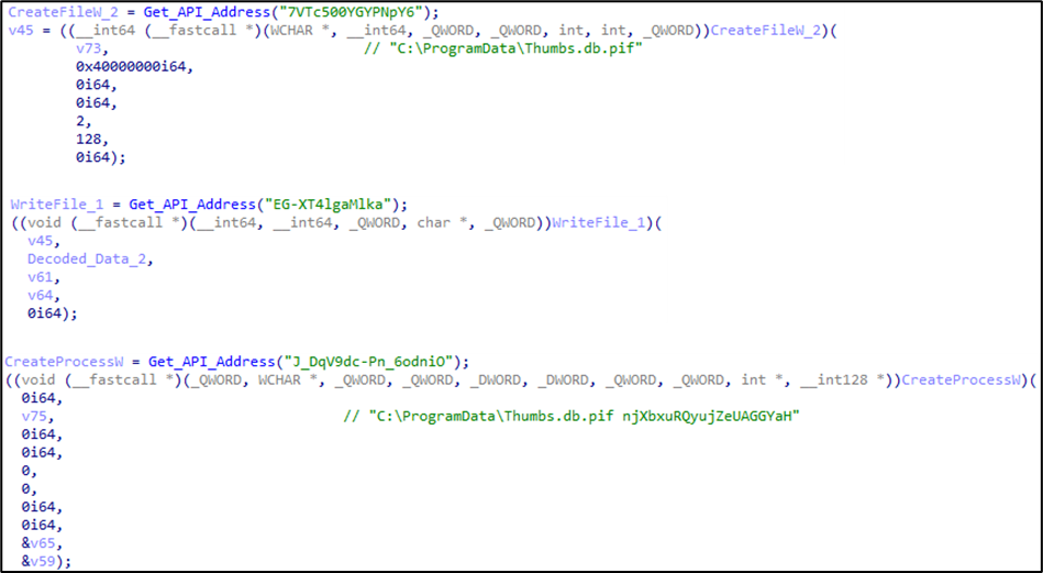 다음은 ‘C:\ProgramData\Thumbs.db.pif’ 파일을 드롭하고, 특정인자 값(‘njXbxuRQyujZeUAGGYaH’)과 함께 실행하는 루틴이다. 해당 파일이 바로 실질적인 악성행위를 수행하는 백도어 악성코드이다.