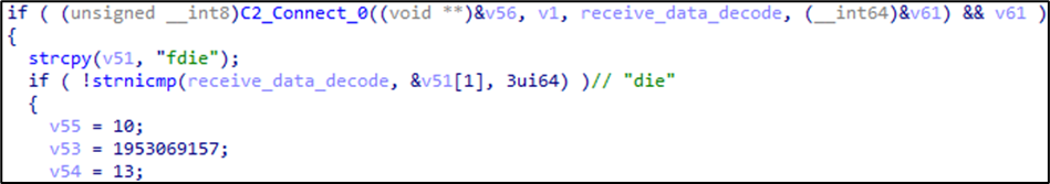 먼저, C2 서버에서 수신한 명령이 “die” 인지 비교한다.