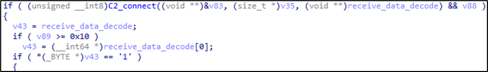 - 후속 데이터를 복호화 한 결과가 ‘1’ 이 아닐 경우 추가적인 악성행위 수행하지 않음