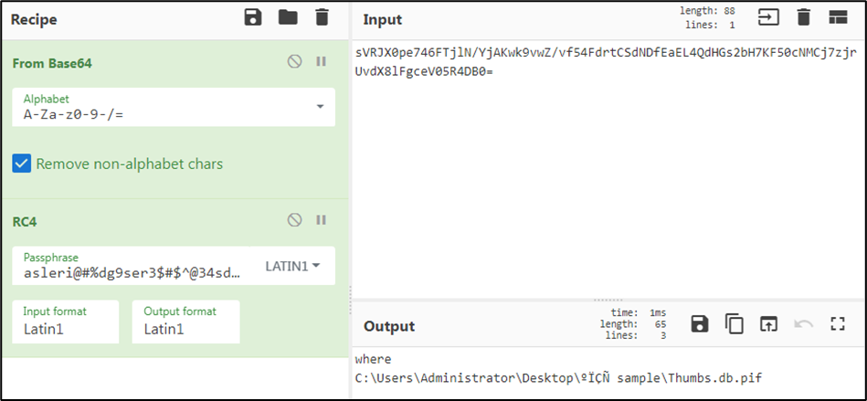 - 후속 데이터(‘y’ 이후 데이터)를 Base64 디코딩 및 RC4 복호화 (RC4 키 값 동일)