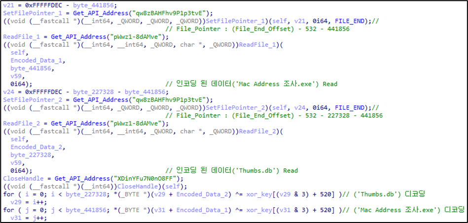 드롭되는 파일의 이름은 각각 ‘Mac Address 조사.exe’, ‘Thumbs.db.pif’ 이며, 샘플 파일 내에서 각 파일의 인코딩 된 데이터가 위치한 오프셋은 다음과 같다.