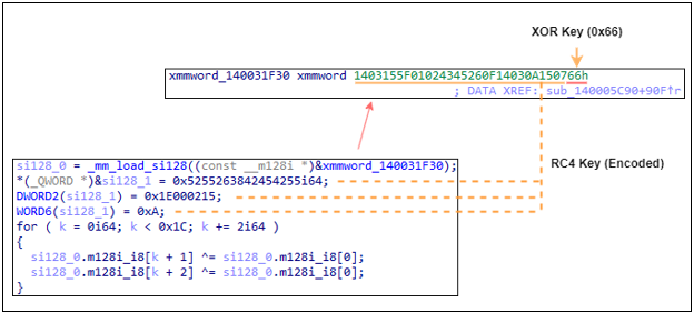 그런 다음, 악성코드 내부 인코딩 된 RC4 Key 값을 디코딩한다. 디코딩 로직은 인코딩 된 RC4 Key 값이 저장된 변수의 첫 1바이트(0x66)를 XOR Key 값으로 사용하여 이를 후속 데이터(인코딩 된 RC4 Key 값)와 XOR 연산을 하는 방식이다.
