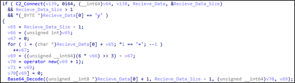 [표 3]과 같은 초기 패킷을 C2 서버로 전송한 이후에는 C2 서버로부터 수신한 데이터를 검증한다. 먼저, 수신한 데이터의 첫 1바이트가 ‘y’인지 비교하고, 일치할 경우 후속 데이터를 base64 디코딩한다.