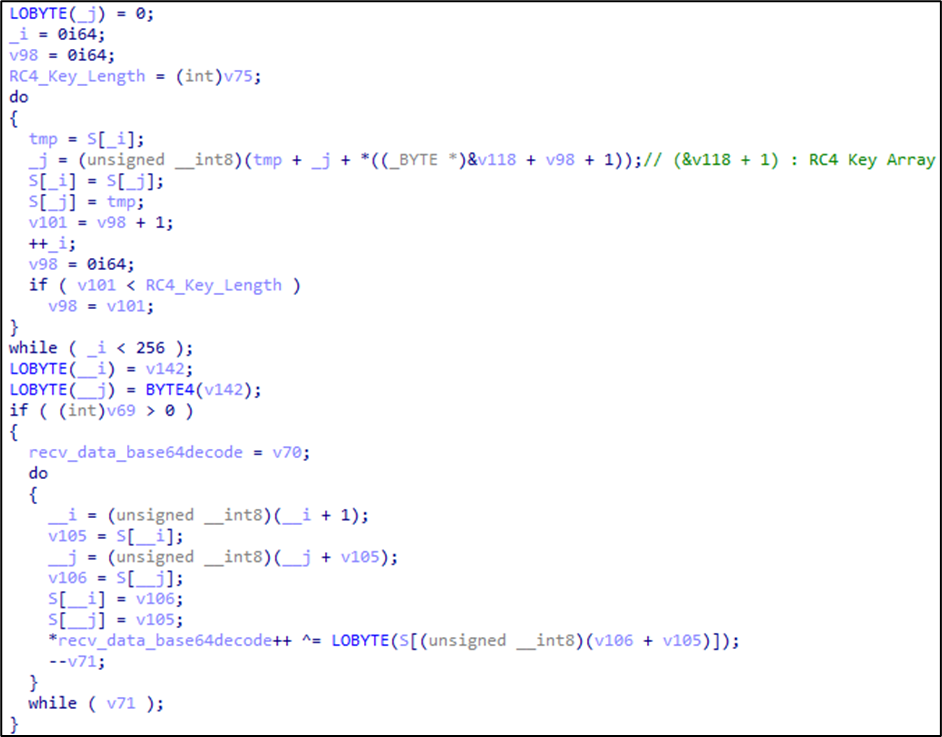RC4 Key 디코딩이 완료되면, [그림 13]에서 base64 디코딩한 수신 데이터를 RC4 알고리즘을 통해 복호화 한다.