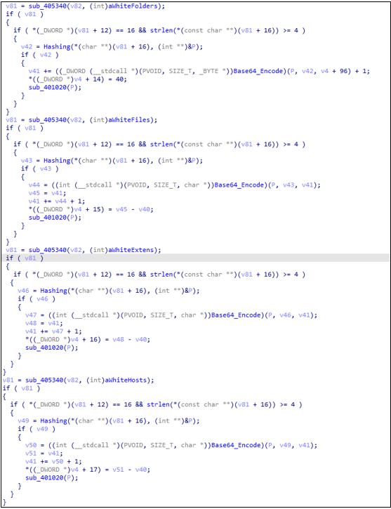 큰 맥락은 복호화 도구 빌드 과정과 유사하지만 세부적으로 살펴보면 차이점들도 존재한다. 설정 파일 내 데이터를 처리하는 로직을 예로 들면, 복호화 도구 빌드 과정에서는 설정 파일의 "white_folders" Key의 값들을 4Byte 해싱 및 Base64 인코딩하였다. 반면, 랜섬웨어 빌드 과정에서는 "white_folders" 뿐만 아니라 "white_files", "white_extens", "white_hosts" Key도 4byte 해싱 및 Base64 인코딩 과정을 거친다.