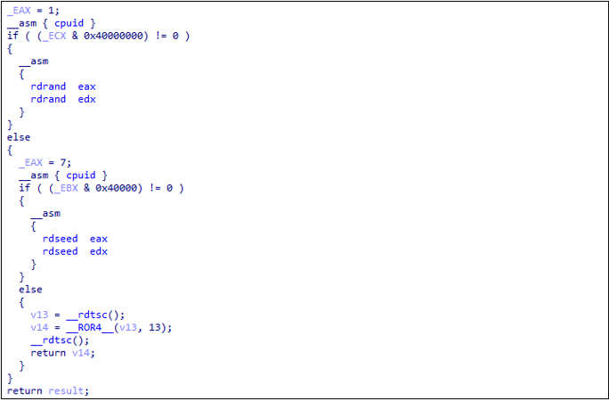 먼저, rdrand, rdseed, rdtsc 등의 어셈블리 명령을 사용하여 난수를 생성한다.