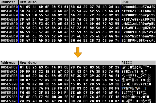 [그림 22] 하단의 최종 인코딩 된 데이터는 복호화 도구에 해당하는 리소스의 특정 섹션에 삽입된다. 그 과정은 다음과 같다.