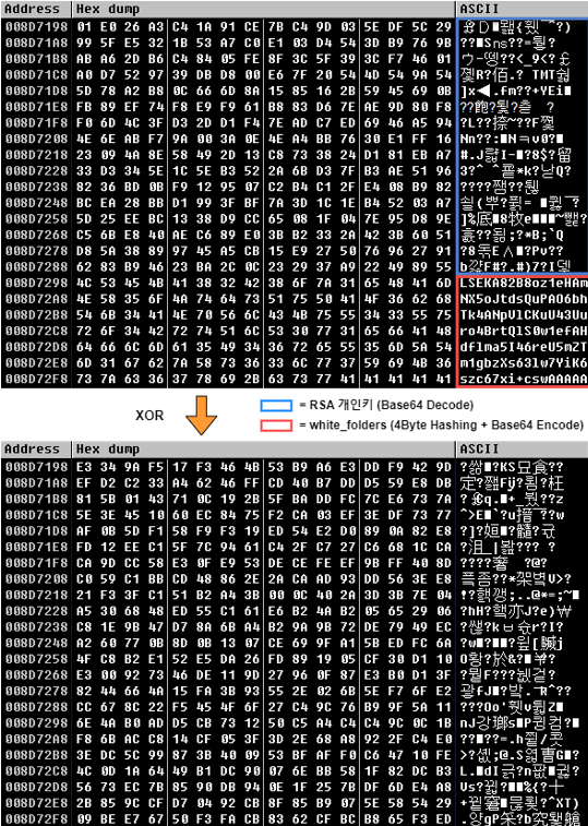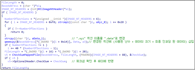 메모리에 로드 된 리소스에서 NT Header를 찾고 해당 오프셋을 기준으로 섹션 명을 탐색하여 “.xyz” 섹션의 이름을 “.data”로 변경한다. 이후, 변경된 섹션에 [그림 22] 하단의 최종 인코딩 된 데이터(RSA 비밀키 + white_folders)를 삽입하고 체크섬을 확인하여 헤더에 반영한다.