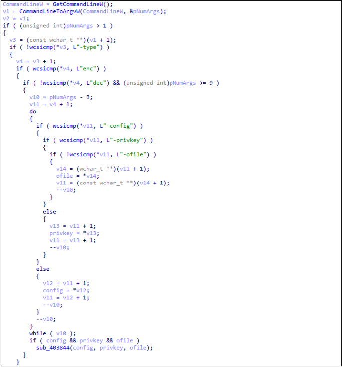 builder.exe는 실행 시 전달받은 인자를 확인하여 ‘-type’ 인자로 전달받은 값이 ‘dec’ 인지 ‘enc’ 인지 비교한다. 만약 ‘dec’ 일 경우, ‘-config’, '-privkey', ‘-ofile’ 인자로 전달받은 값을 특정 함수(sub_403844)에 파라미터로 전달한다.